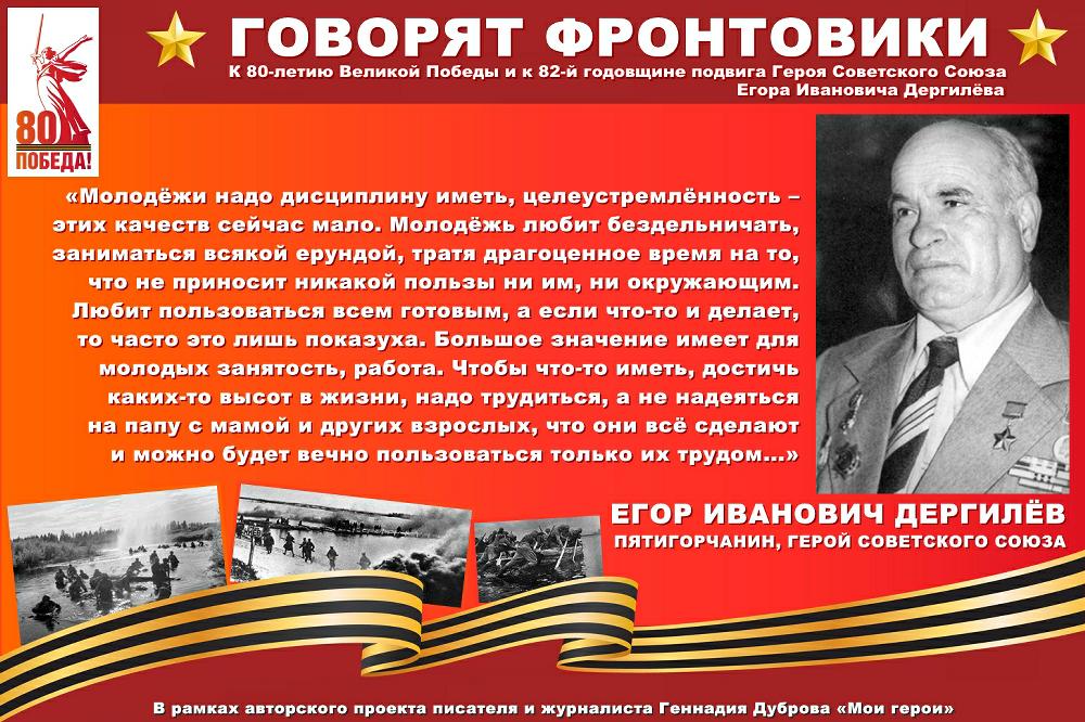 «Говорят фронтовики» – авторский проект поэта, прозаика, журналиста Геннадия Дуброва, рассказывающий о пятигорчанах – участниках Великой Отечественной войны, о писателях-фронтовиках, о славных сынах и дочерях нашего Отечества. Живая речь героев, большая часть из которых ушли в Бессмертие, а многие, как Нина Попцова и Герман Пестов, и вовсе не дожили до Великой Победы, должна звучать в веках. Как и не должна ни на миг померкнуть память обо всех, кто отдал свои жизни за Родину. Проект стартовал в 2021 году.
