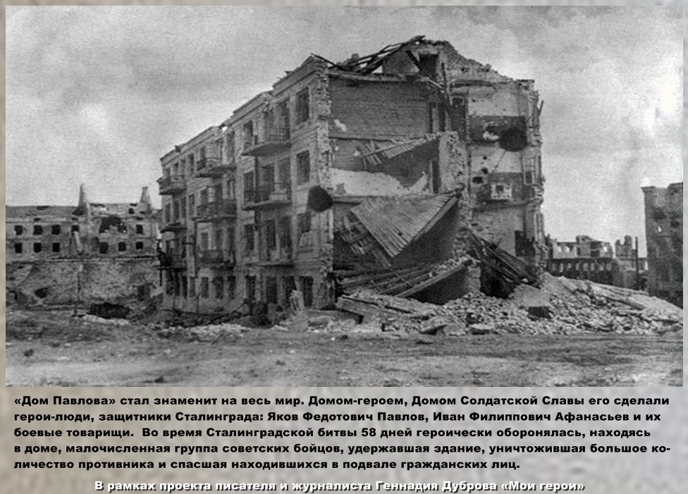 Сталинградская битва началась 17 июля 1942 года и стала крупнейшей сухопутной битвой в ходе всей Второй мировой войны. Её главное значение в том, что в ходе неё произошёл коренной перелом в противостоянии советских войск и немецко-фашистской армады, превосходившей по численности и вооружению. В этом беспрецедентном сражении, одном из самых кровопролитнейших и жестоких, советский народ явил подвиг стойкости, мужества, героизма, сражаясь за каждую пядь земли города на Волге. Интенсивность и продолжительность битвы были таковы, что в городе не осталось живого места от бомбёжек и артиллерийских обстрелов. На протяжении 200 дней обороны Сталинграда отдельные районы, улицы, дома и территории города и его окраин по несколько переходили из рук в руки. Домом-легендой стал Дом Павлова, за который развернулось беспрецедентное сражение. С каждой стороны погибло и было ранено свыше миллиона человек.