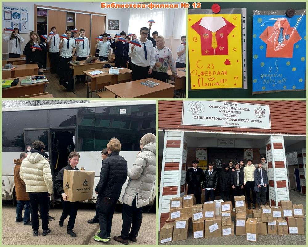 Сотрудники библиотеки-филиала № 12 провели для учащихся частной школы «Геула» благотворительную акцию «Письмо солдату» со сбором благотворительной помощи участникам СВО, а для учеников 4-го класса был проведён мастер-класс по изготовлению поздравительных открыток для пап.