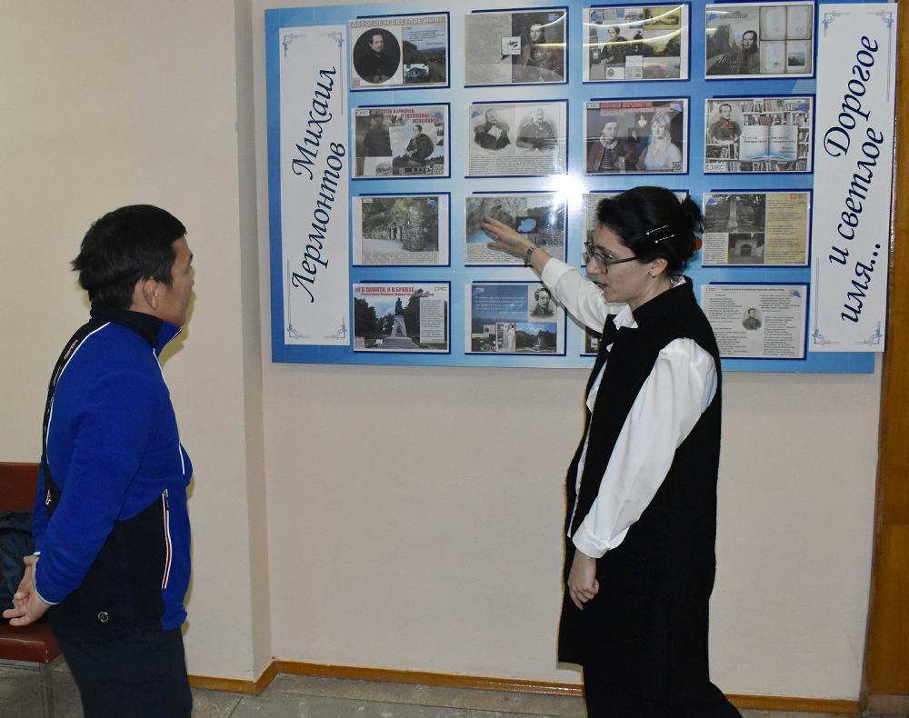 Экспозиции рассказывает об интересных и малоизвестных фактах, связанных с жизнью Лермонтова, о связи его судьбы с судьбой Пушкина, об интересе поэта к личности героя Отечественной войны 1812 года, наместника Кавказа, генерала Алексея Ермолова. А ещё посетители смогут прочитать поучительные высказывания поэта, строки из его стихов, посвящённых Кавказу, ознакомиться с его переводами любимых им стихотворений лорда Байрона, творчество которого Михаил Юрьевич очень ценил, восхищаяясь, как и Пушкин, личностью великого английского поэта. Узнать о Лермонтове-художнике и Лермонтове-читателе.