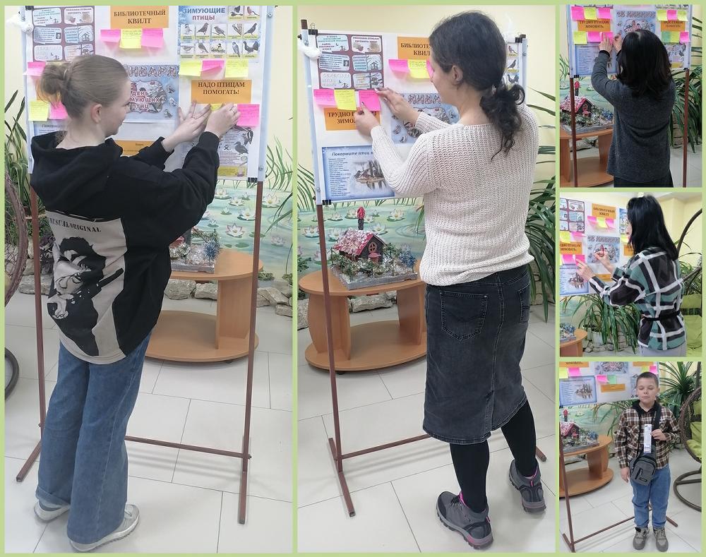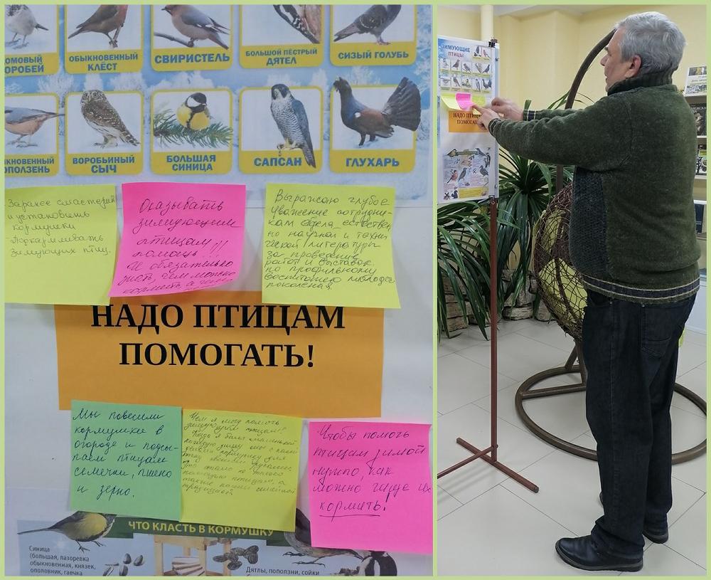 Целью библиотекарей было привлечь внимание к проблеме, с которой сталкиваются птицы, остающиеся в Пятигорске на зимовку – нехваткой корма и холодом. Всем желающим сотрудники отдела естественно-научной и технической литературы предлагали ответить на вопрос «Как мы можем помочь птицам зимой?», а ещё выразить своё личное мнение, надо ли это делать, как и почему. Каждый написал, что он думает, на стикере, которые прикреплялись к информационному стенду.