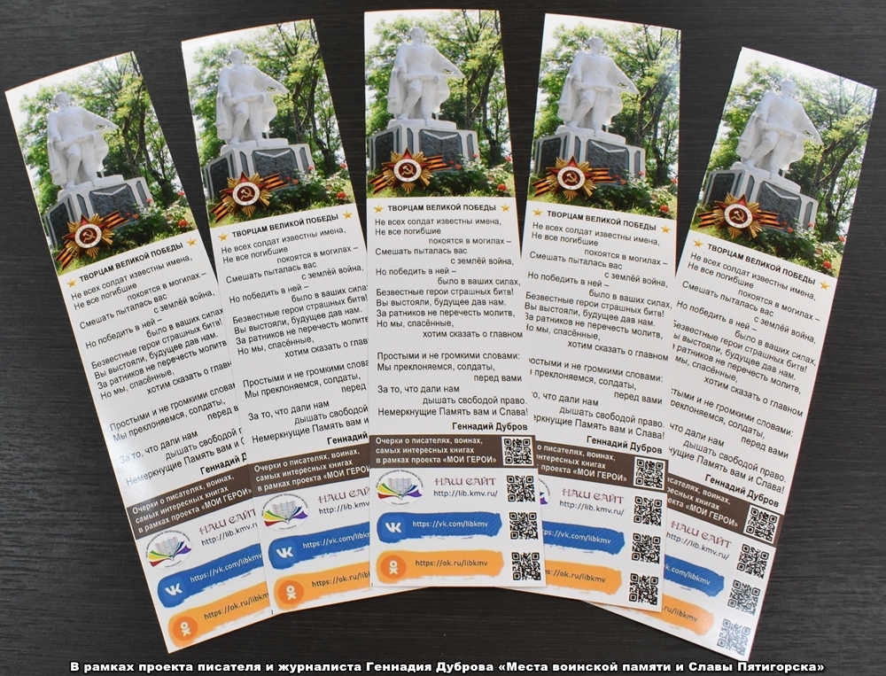 А на память каждый из студентов получил эксклюзивный подарок – книжную закладку, выпущенную Пятигорской библиотекой в рамках проекта писателя и журналиста Геннадия Дуброва «Места воинской памяти и Славы Пятигорска», на которой изображён памятник Советскому солдату, расположенный в нашем городе, недалеко от Провала.