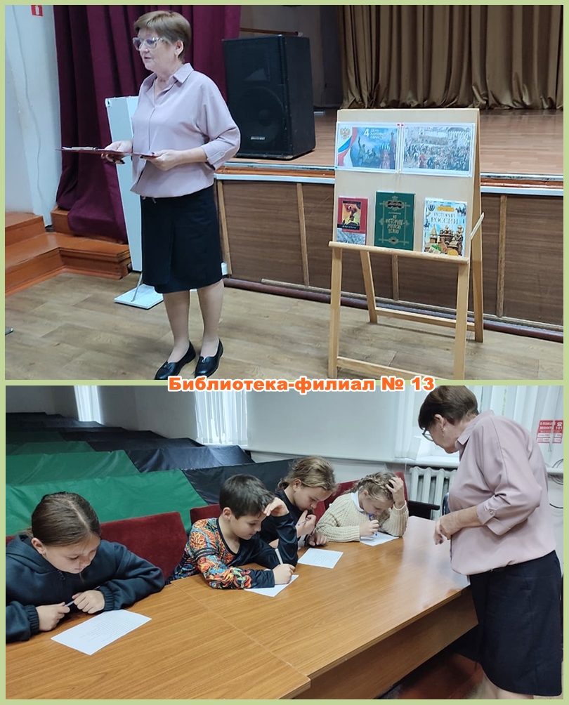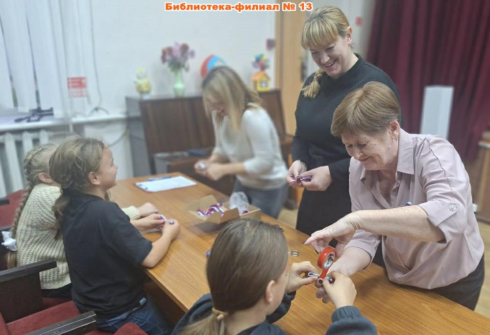 В библиотеке-филиале № 13 совместно с ДК посёлка Нижнеподкумский проведена беседа «Мы вместе, мы едины!» для учащихся школы № 24. Ребята познакомились с историей праздника, узнали о подвиге Кузьмы Минина и Дмитрия Пожарского, поиграли в ассоциативную игру «За что мы любим нашу Родину» и приняли участие в мастер-классе по изготовлению значков «Триколор».