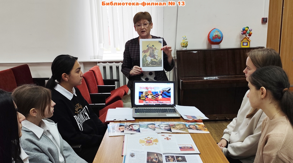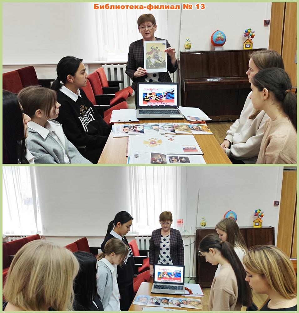 В библиотеке-филиале № 13 прошёл урок мужества «В жизни есть место подвигу», в котором приняли участие восьмиклассники из школы № 24. Во время беседы о героях России разных времён они узнали историю учреждения высших воинских наград. В конце мероприятия участники почтили память минутой молчания.