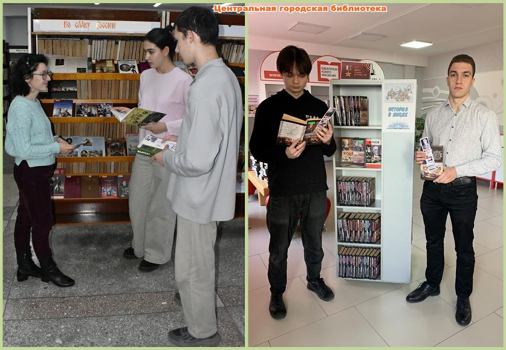 В Центральной городской библиотеке проходят обзоры у книжных выставок, приуроченных к Дню героев Отечества, во время которых читателям сотрудники рассказывают не только о книжных изданиях на военную тематику, но и о героях-пятигорчанах – солдатах, офицерах, военачальниках, прославленных полководцах настоящего и прошлого. В подарок участники акции получают книжные закладки, выпущенные в рамках проекта писателя и журналиста Геннадия Дуброва «Герои Пятигорска» и рассказывающие о тех защитниках Отечества, кем особо гордится Пятигорск.
