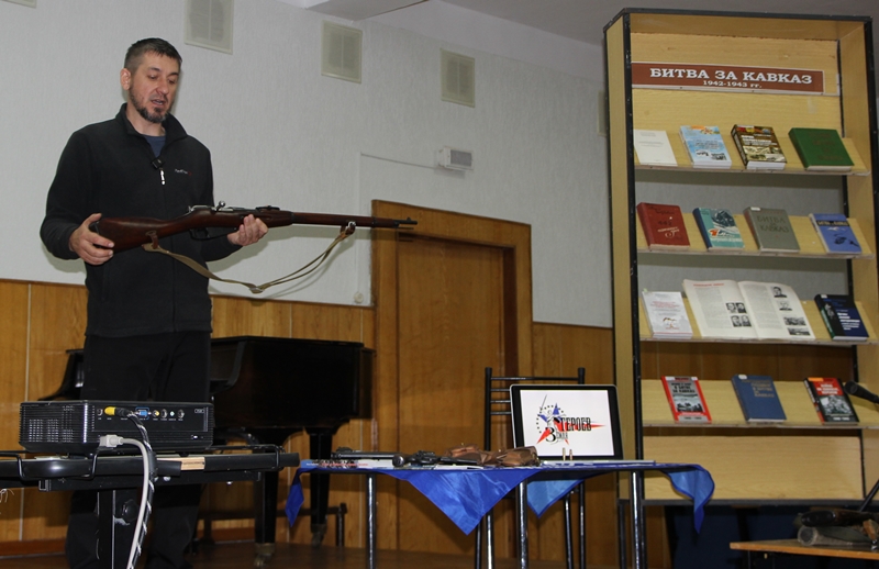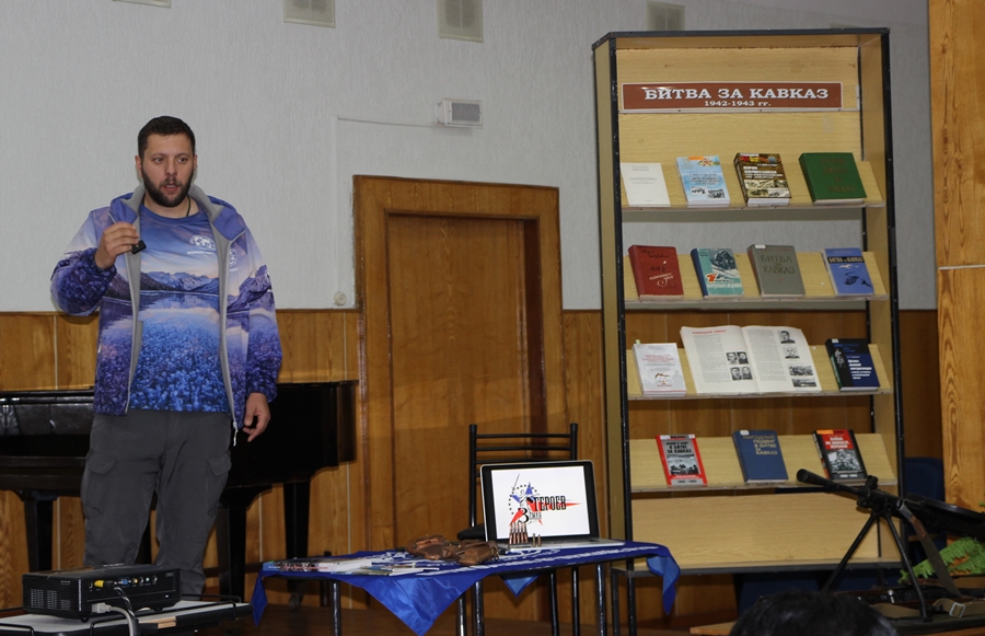 В этом году исполнилось 180 лет Русскому географическому обществу и 55 лет Пятигорскому отделению РГО. Краеведчекий центр «Пятигорье» организовал встречу учащихся города с членами правления Общества и его молодыми энергичными, полными идей и планов активистами. К своему двойному юбилею и 80-летию Победы, энтузиасты своего дела члены РГО, подготовили познавательную, патриотическую программу, которая называется «Земля героев». Председатель А. Асуров обратился к истории Русского географического общества в годы войны, остановив свое внимание на нескольких ярких и малоизвестных фактах участия РГО в военных действиях, кроме того его выступление коснулось и экспедиционной и общественной деятельности регионального отделения на современном этапе. По очереди выступали перед ребятами все члены Общества - В. Стадник, Е. Стасенко, А. Федурина, Е. Сафронович и каждому было что показать и о чем увлекательно и красноречиво рассказать аудитории. Сотрудники справочно-библиографического отдела подготовили книжную выставку, посвященную одной из самых важных сражений Великой Отечественной войны - Битве за Кавказ. Самой познавательной частью можно считать выступление С. Демченко, который привез на встречу свою коллекцию обезвреженного (специально подготовленного для просмотра) боевого оружия. С огромным интересом школьники рассматривали наган, пистолет, винтовку, автомат, пулемет и затаив дыхание слушали о том, кто изобрел это оружие и в каких боях Великой Отечественной его использовали наши военнослужащие. Более двух часов шла встреча, но время пролетело незаметно, потому что выступающие сумели искренне, познавательно и убежденно поднять и раскрыть на примерах самую актуальную сегодня тему, тему патриотизма и ребята поняли главное — патриотизм выражается в делах, а не на словах. Приглашенные, организаторы и участники долго не расходились. Много вопросов прозвучало и на все вопросы невозможно было в формате одной встречи получить ответы и тогда возникла идея встретиться еще раз в начале следующего года.